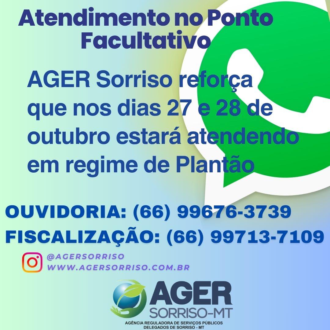 Ager - Agência Reguladora de Serviços Públicos Delegados de Sorriso - MT Rua Marechal Candido Rondon, n° 2311, esquina com a Rua Costa e Silva, Bairro Bela Vista. (66) 3907-8001 / (66) 99676 3739 Segunda à Sexta, 07h às 13h