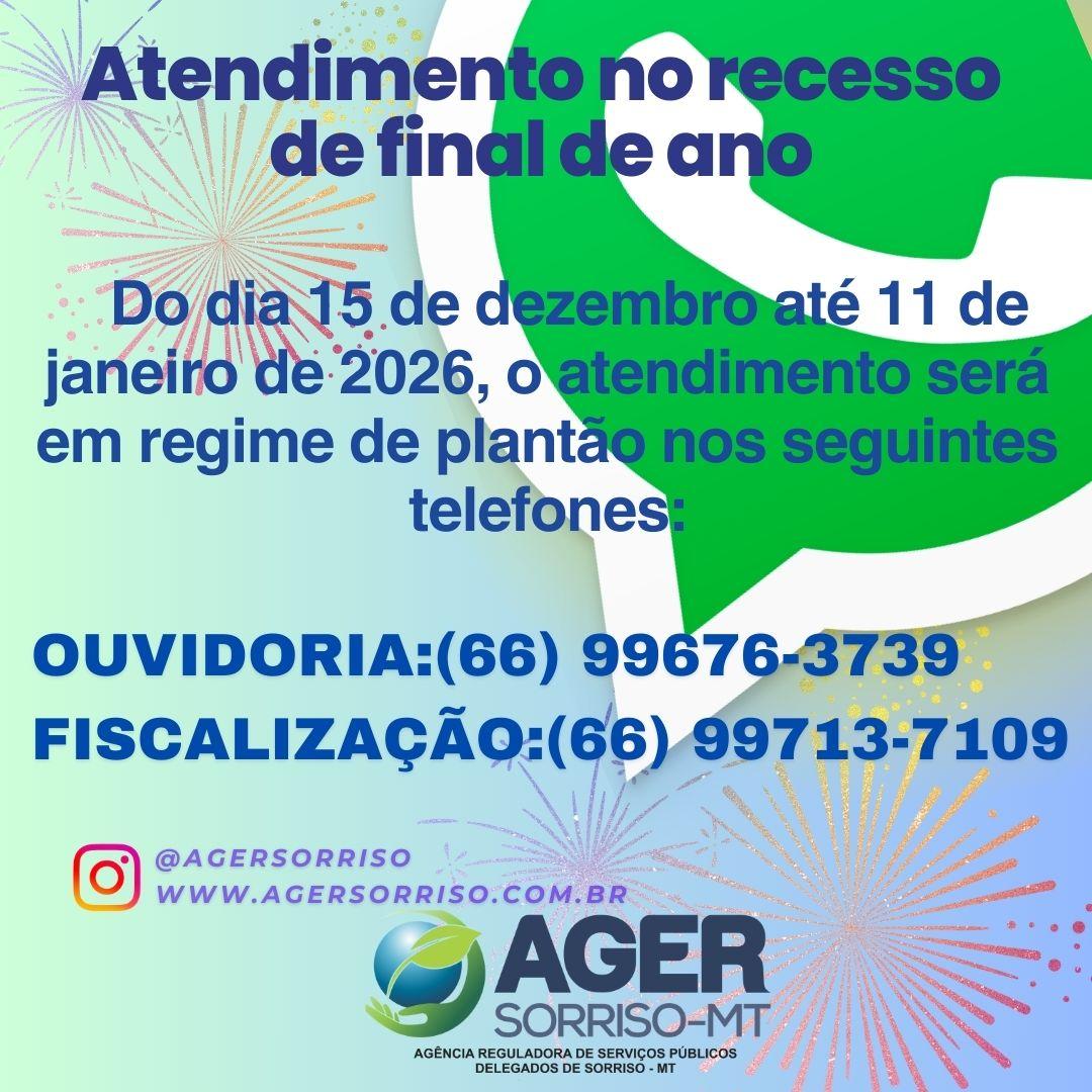 Ager - Agência Reguladora de Serviços Públicos Delegados de Sorriso - MT Rua Marechal Candido Rondon, n° 2311, esquina com a Rua Costa e Silva, Bairro Bela Vista. (66) 3907-8001 / (66) 99676 3739 Segunda à Sexta, 07h às 13h